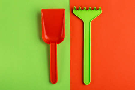 Colorful toy spade and rake on bright background. Copy space