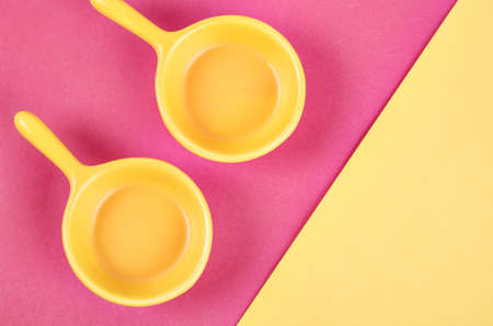 Empty yellow cups on pink and yellow background.
