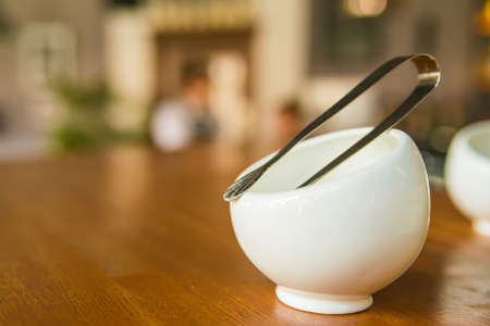 Sugar cubes in sugar bowl and sugar tongs