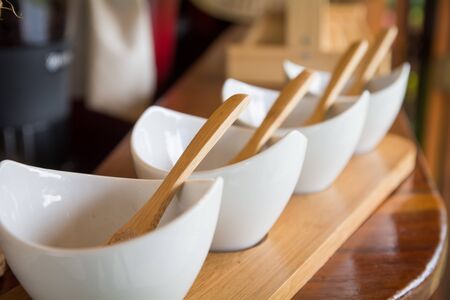 Closeup of ice cream spoons in bowl on counter at store