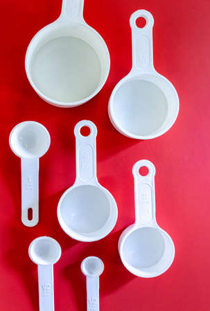 Set of white measuring cups, measuring spoons use in cooking lay on wooden red background in top view
