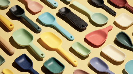 A captivating arrangement of various plastic spoons and scoops in a spectrum of colors, showcasing playful shapes and vibrant hues on a sunny yellow background.