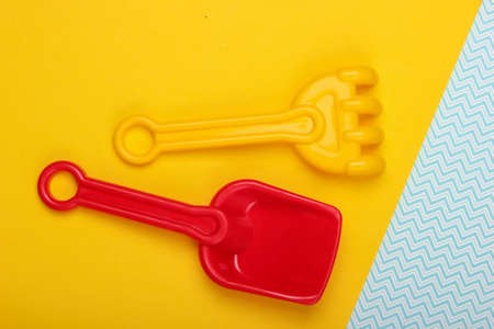 Children's rake and shovel for a sandbox or beach on yellow blue studio background. Top view