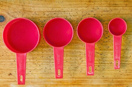 Red measuring cups in different sizes on a timber board