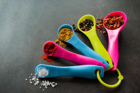 Closeup multicolored measuring spoons with spices: chili flakes, a mix of pepper peas, curry, paprika and coarse sea salt. Black chalk board background with copy space.