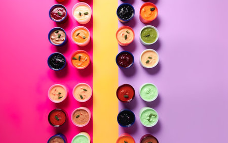 A stunning array of vibrant dipping sauces in small bowls showcases an enticing variety of colors and textures, perfect for enhancing any dish.