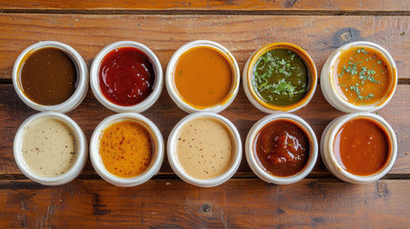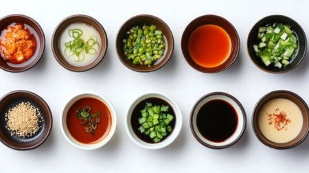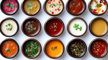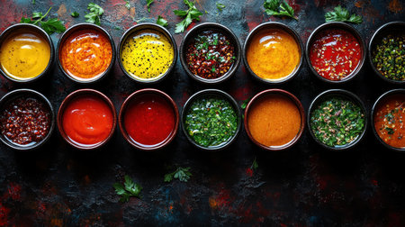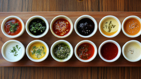 A visually appealing arrangement of various sauces and condiments in small bowls, showcasing a rich diversity of flavors and textures for culinary adventures.