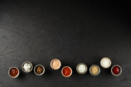 Different types of sauces on black painted OSB plate. Top view.