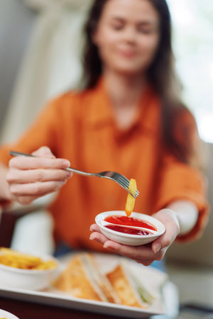 A young woman enjoying healthy snacks with ketchup and mustard, showcasing vibrant colors and a joyful emotion in a cozy indoor setting