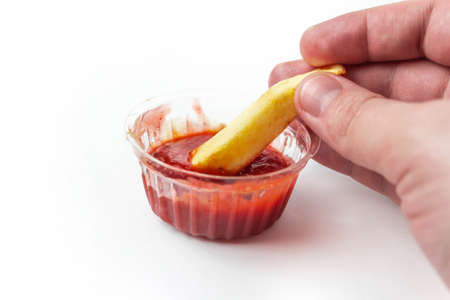 Ketchup in a plastic sauceboat with french fries on a white background isolate