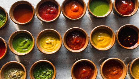 Various sauces served in small bowls, creating a colorful and flavorful assortment