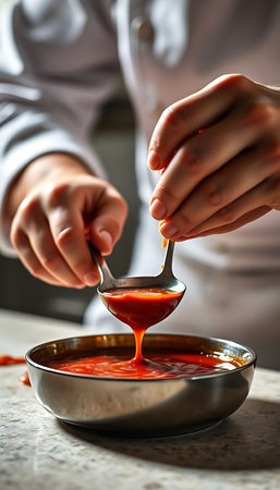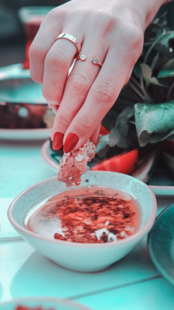 person is dipping sauce into a bowl