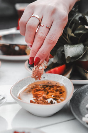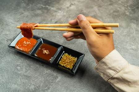 A person is eating with chopsticks and dipping food into a sauce. Concept of enjoyment and relaxation as the person savors their meal