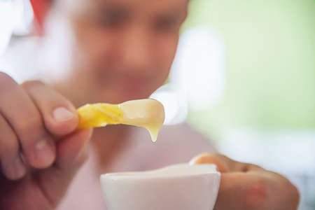 Man show French fries dip in cream sauce