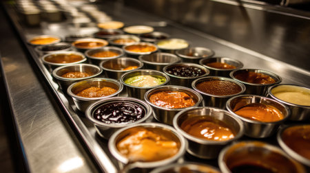 Lots of sauces close up. Tomato, cheese and spicy sauce. Generative AI