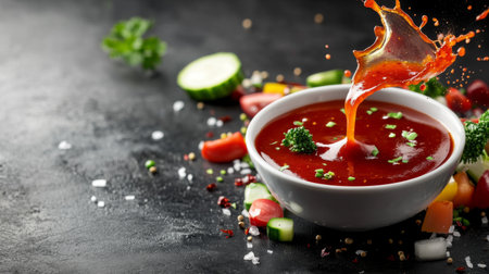 A delightful composition of assorted vegetables dipped into a bowl of chili sauce, with a splash of sauce captured mid-air, illustrating the delicious experience