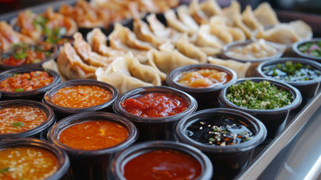 A vibrant display of assorted dipping sauces paired with dumplings captures the essence of culinary delight, perfect for festive gatherings and special meals.