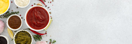 Different types of sauces in bowls with seasonings banner, rosemary and pepper, thyme and garlic, lime and lemon, cilantro, top view, copy space