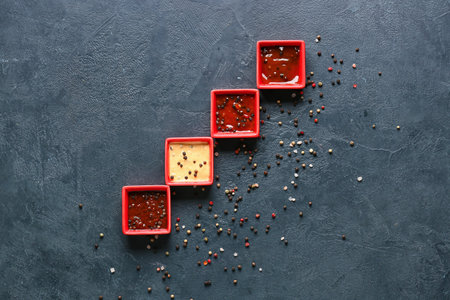 Bowls with peppercorn sauce on dark background