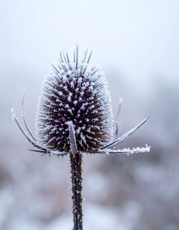 In the quiet stillness of a winter morning, delicate ice crystals form a fragile coat on a wild teasel.