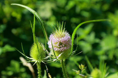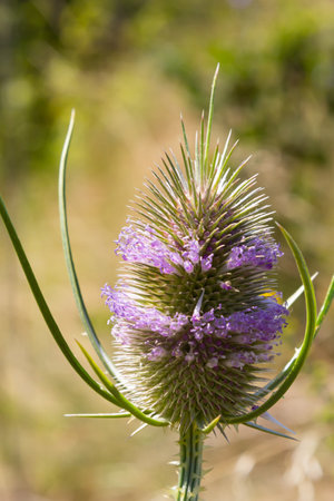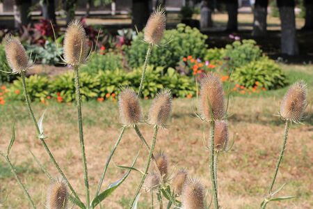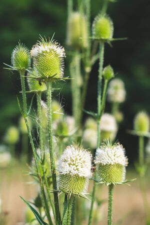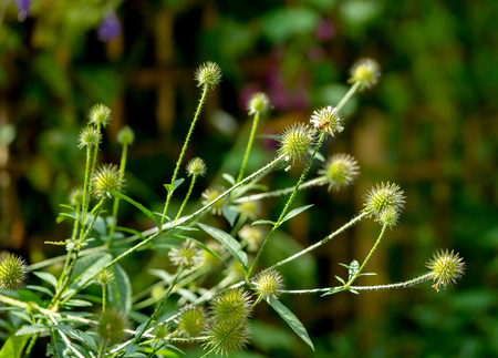 Beautiful garden flowers. Teasel plant in sunlight.