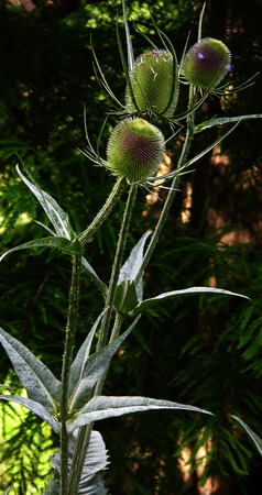 Several Wild Teasel plants Dipsacus fullonum stand tall. The seed heads display purple flowers emerging from their spiky green structures. Light filters through the plants.