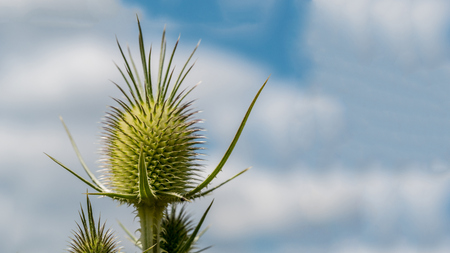 A close up of the head of a teasel which is losing the flowers. The natural out of focus background has space for text