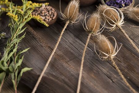 Close up of wild teasel flowers on a wooden table