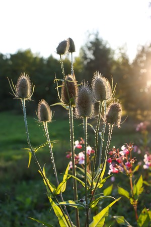 Dawn sunlight with silhouette of wild teasel flowers
