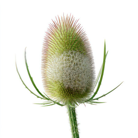 Isolated cutout of a teasel flower with green and spiky texture, set against a white background. Perfect for nature-themed designs and botanical illustrations.