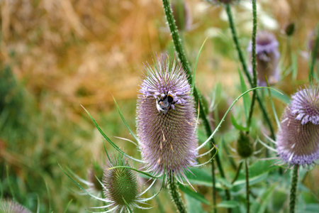 A selective focus shot of a bug on a wild teasel