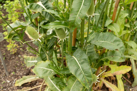 Tall plant, green, a type of burdock grows in the forest in summer