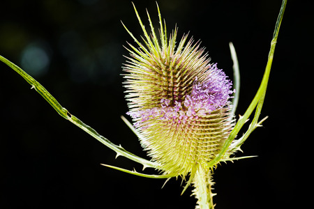 purple prickly plant in focus on the dark background, note shallow depth of field