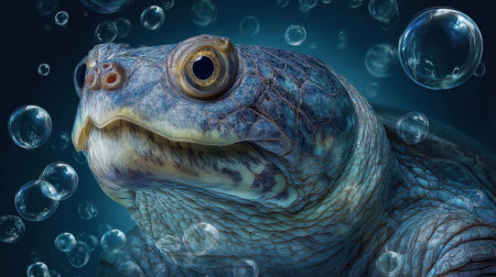A striking close-up of a turtle swimming in clear water surrounded by bubbles. The image captures the intricate textures of its shell and serene atmosphere.