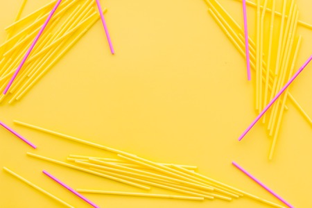 Plastic jar with wooden bamboo toothpicks lies on a yellow background. Oral hygiene after eating.