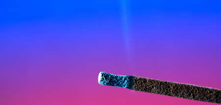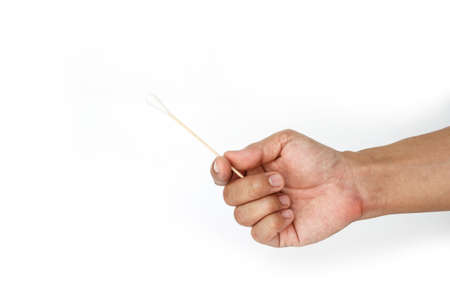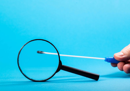 Sterile probe with a cotton swab for taking a nasal swab on a blue background, close-up. Concept of infections on the nasal mucosa.