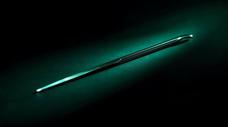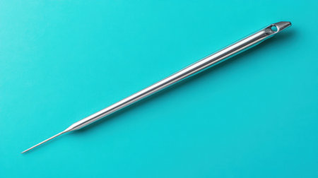 This image features a close-up view of a sleek metal needle with an eye, set against a vibrant turquoise background. Ideal for craft and sewing projects.