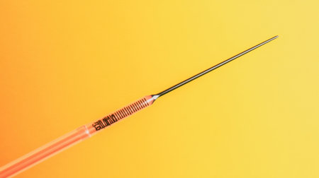 A close-up view of a sharp syringe needle with a vivid orange hub against a bright yellow background. Ideal for medical and healthcare themes.