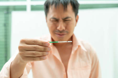 Pregnancy measurement sheet holding in hand blurred image a man making a sad face on white background,
