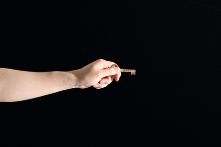 A hand in a blue glove holds a wooden pointer against a black background. Side view. Diagnosis, Treatment, Health and Medicine.