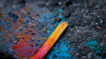 A close-up of a popsicle stick, discarded on the ground, sticky and slightly stained with vibrant color