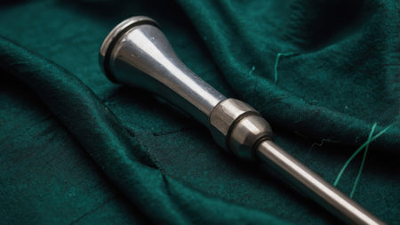 A sleek metal tool lies elegantly across rich dark green fabric, capturing the light and revealing its design. The setting suggests a creative workspace or craft project.