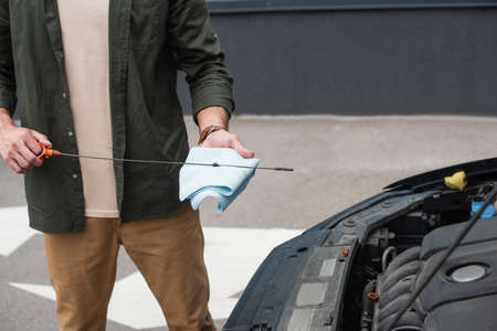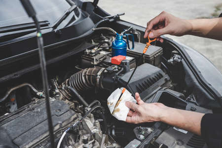 Home service car concept : A man check level of engine oil and see the stains from use basic maintenance of car