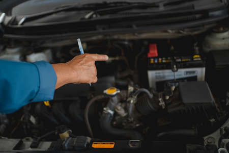 Young auto mechanic checking the engine. He pointed at the engine with his hand.