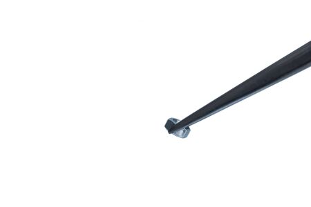 Tweezers holds a screw on a white background.Tweezers holds a screw on a white background