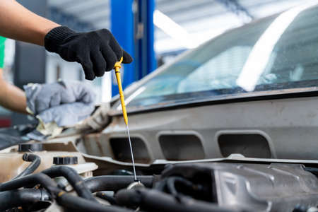 Auto Mechanic checking oil Selective focus with shallow depth of field