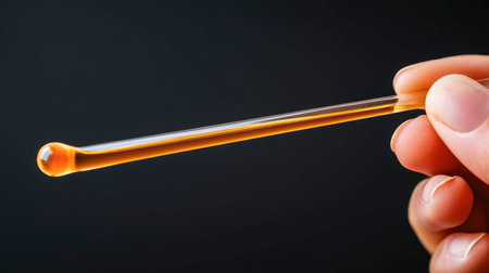 A close-up view of a hand holding a test tube filled with an orange liquid, emphasizing the clarity of the glass and the precision required in scientific experiments.