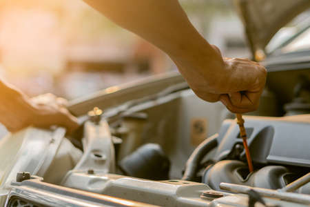 Services car engine machine concept, Automobile mechanic repairman hands checking a car engine automotive with oil level in the engine transportation, car service and maintenance.