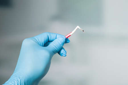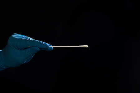 Close up of doctor's hand handling a smear test or swab test in front of a black background