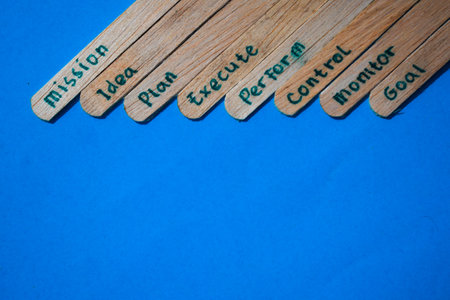 stick of ice cream with the words mission, idea, plan, execute, perform, control, monitor, goal. Motivational quotes, strategy business, marketing words. Isolated on background